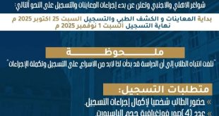 تهنئ كلية نهر النيل للعلوم والتكنولوجيا الطلاب المقبولين بالكلية لهذا العام في تقديم شواغر الاهلي والاجنبي وتعلن عن بدء إجراءات المعاينات والتسجيل على النحو التالي: بداية المعاينات و الكشف الطبي والتسجيل السبت 25 اكتوبر 2025 م. نهاية التسجيل السبت 1 نوفمبر 2025 م. ملحوظة: – “نلفت انتباه الطلاب إلى أن …