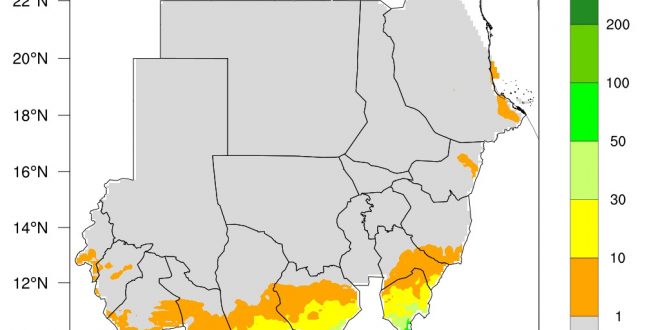 • يتراوح فرص هطول أمطار خلال فترة التوقع مابين (01-10) ملم في أقصي جنوب شرق ساحل البحر الاحمر، شرق ولاية كسلا، جنوب ولاية القضارف، أواسط و شرق ولاية سنار، شمال ولاية النيل الازرق، أواسط ولاية جنوب كردفان، جنوب ولاية غرب كردفان، جنوب ولاية شرق دارفور، أواسط ولاية جنوب دارفور و اقصي جنوب ولاية غرب دارفور و مابين (10-30) ملم في أواسط ولاية النيل الازرق، جنوب ولايتي جنوب و غرب كردفان، جنوب ولاية شرق دارفور وجنوب ولاية جنوب دارفور و مابين (30-40) ملم في اقصي جنوب ولاية النيل الازرق و اقصي جنوب شرق ولاية جنوب دارفور.