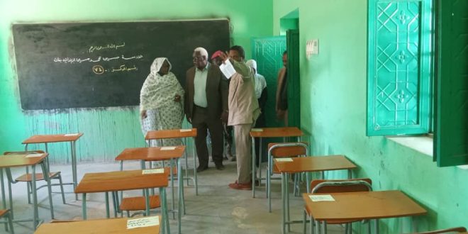 والصورة لوالي نهر النيل محمد البدوي ووزير المالية اميرة أحمد حسن داخل احد الفصول التي نفذها صندوق التنمية المحلية مع الاجلاس بمدرسة خليوة.