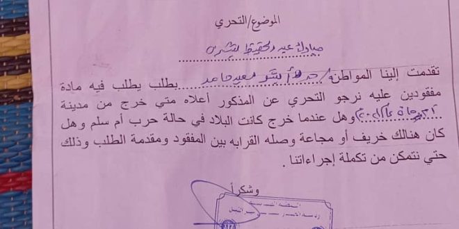 تقدمت إلينا المواطن حرة ابشر سعيد حامد بطلب يطلب فيه مادة مفقودين عليه نرجو التحري عن المذكور أعلاه متي خرج من مدينة امدرمان عامل ٢٠٢١) وهل عندما خرج كانت البلاد في حالة حرب أم سلم وهل كان هنالك خريف أو مجاعة وصله القرابه بين المفقود ومقدمة الطلب وذلك حتي نتمكن من تكملة إجراءاتنا .