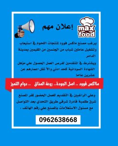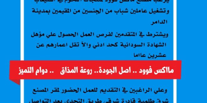 يرغب مصنع ماكس فوود لمنتجات اللحوم في استيعاب وتشغيل عاملين شباب من الجنسين من المقيمين بمدينة الدامر ..